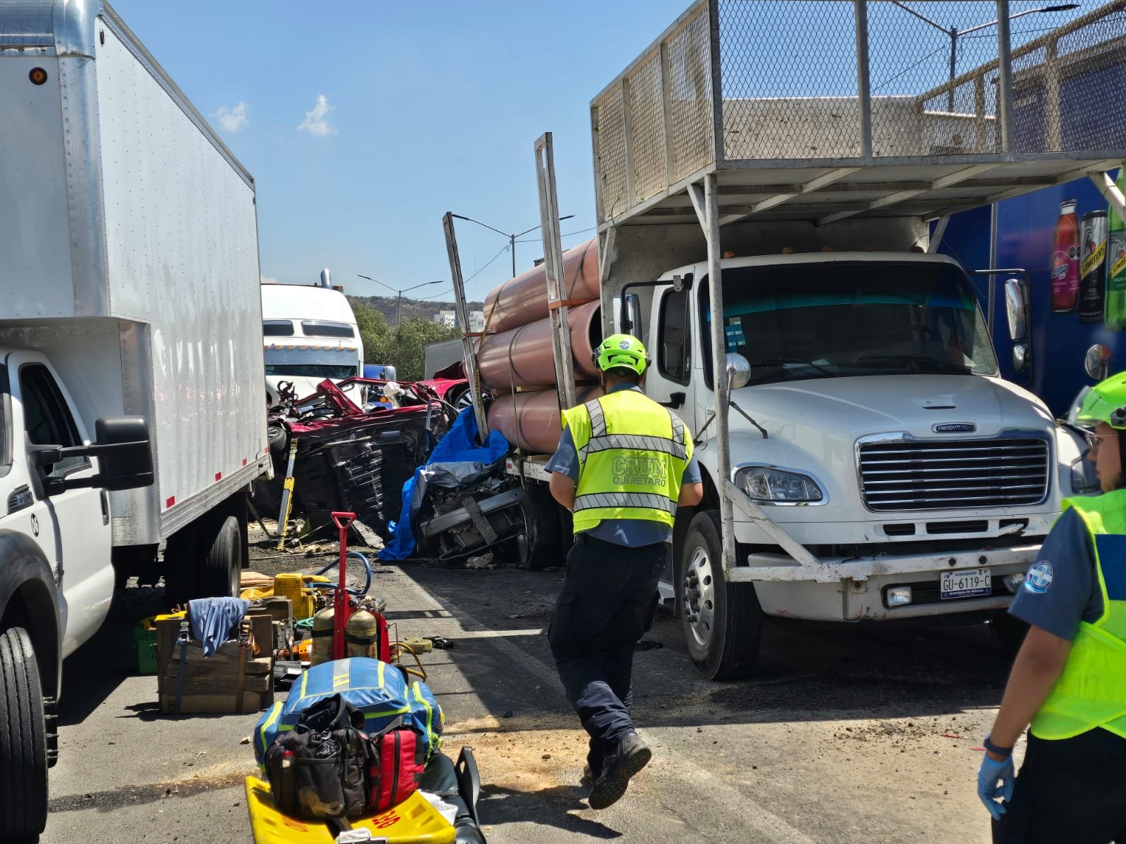 El accidente ocurrió frente al Estadio Corregidora y se originó tras un primer choque por alcance a la altura de la colonia Cimatario, lo que generó intensa carga vehicular. En ese contexto, el operador de un tráiler de caja seca que circulaba a exceso de velocidad no logró frenar e impactó a más de diez vehículos.