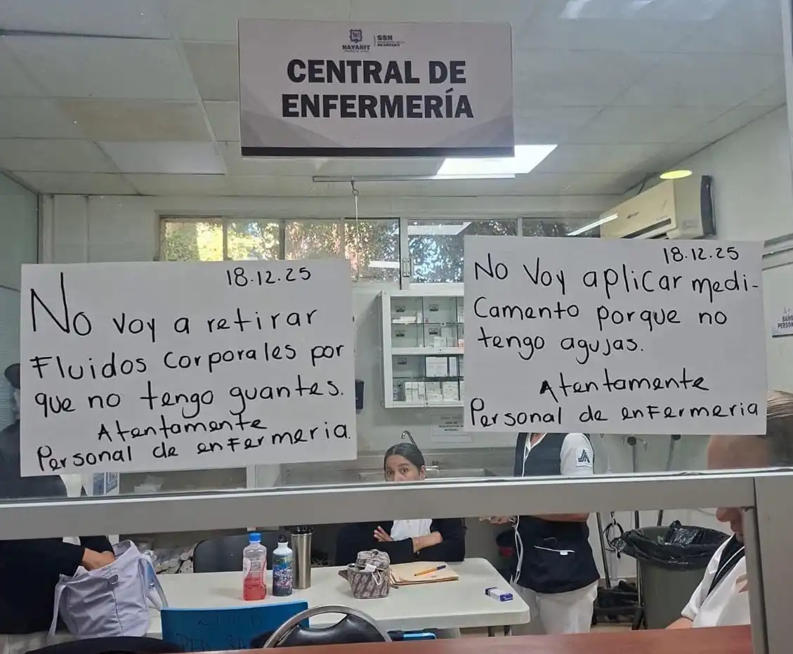 Para visibilizar la situación, colocaron hojas con mensajes que, señalaron, no deberían existir en un hospital. En ellos advirtieron que no pueden retirar fluidos ni aplicar medicamentos debido a la falta de agujas y guantes, una condición que afecta directamente la atención a los pacientes.