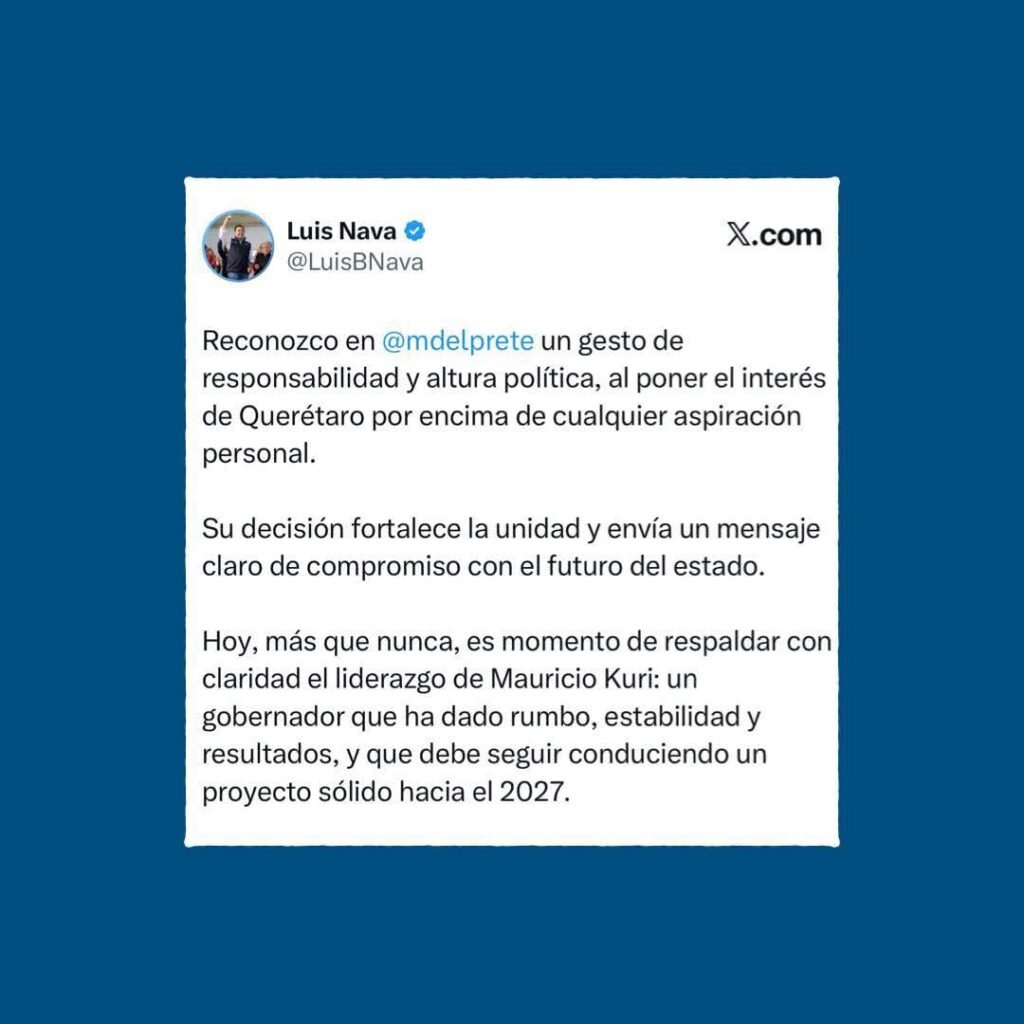 “Reconozco en Marco del Prete un gesto de responsabilidad y altura política, al poner el interés de Querétaro por encima de cualquier aspiración personal”, expresó Nava Guerrero en su mensaje, en referencia al anuncio previo del titular de la Sedesu.