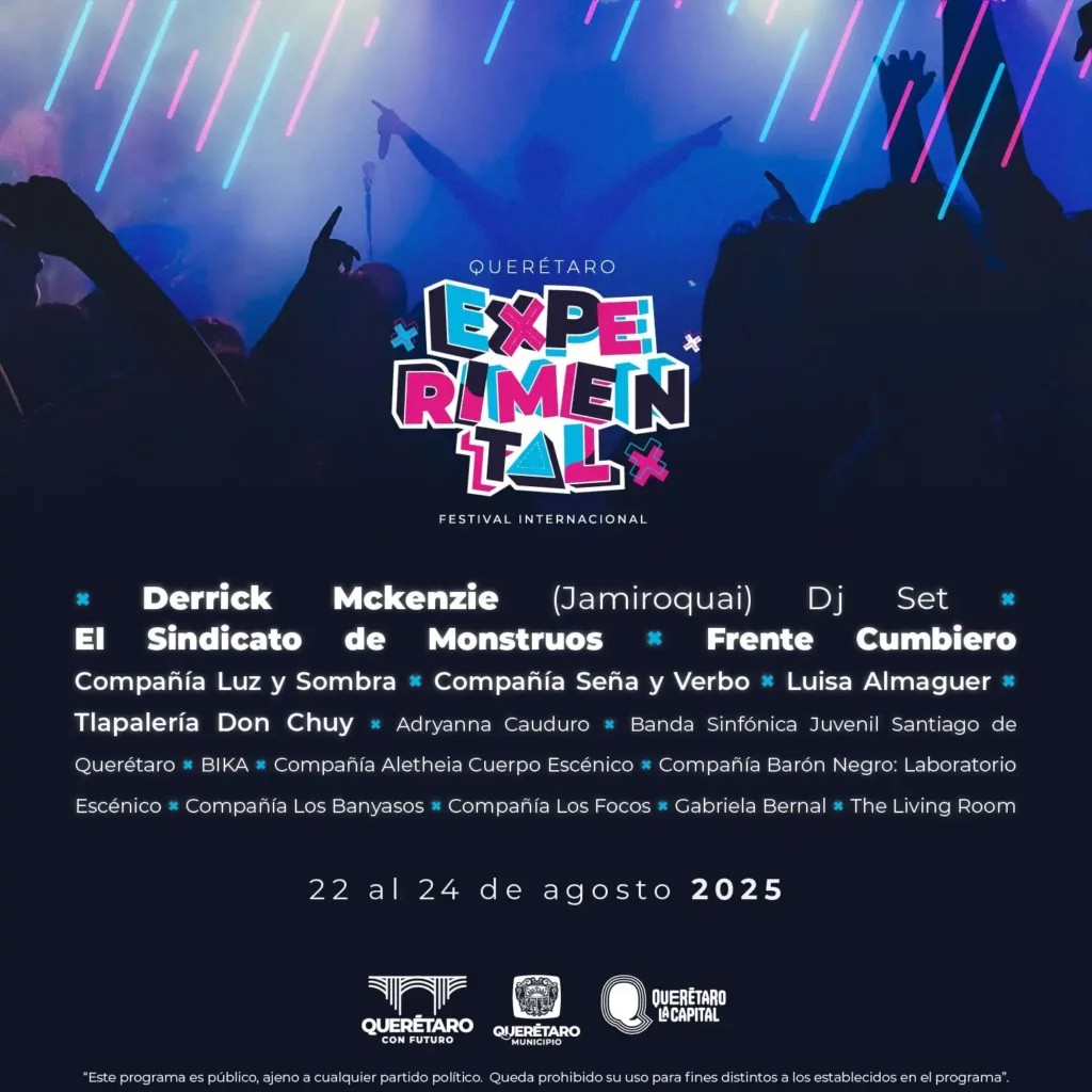 El Municipio de Querétaro presentó la cuarta edición del Festival Querétaro Experimental, que se realizará del 22 al 24 de agosto en el Jardín Guerrero, Cineteca Rosalío Solano y Teatro de la Ciudad. El evento reunirá 20 espectáculos con 101 artistas, de los cuales 60 por ciento son talento local, además de compañías nacionales e internacionales. La programación incluirá música, danza, teatro, circo y pasacalles con artistas de Querétaro, CDMX, Aguascalientes, Reino Unido, España y Colombia.