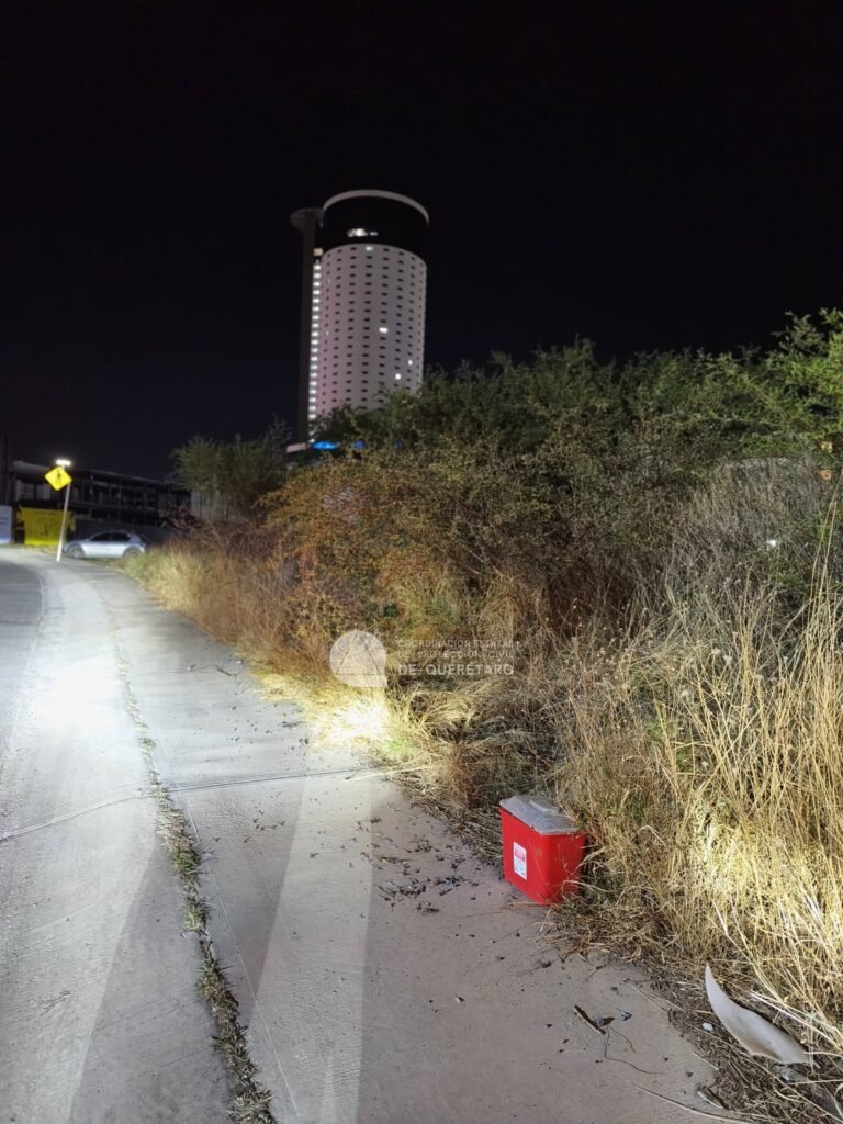 Autoridades atendieron un reporte por la presencia de residuos peligrosos biológico-infecciosos en la colonia Juriquilla, en el municipio de Querétaro, donde se detectó un contenedor con material punzocortante derramado sobre un paso peatonal.